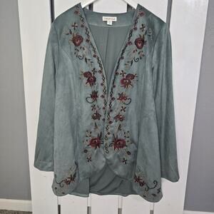 Coldwater Creek Womens Cardigan Teal Aztec Floral Embroidered Open Front Artsy L