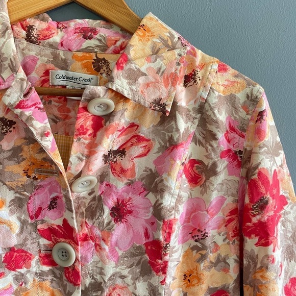 Coldwater Creek women's floral jacket. Pink, tan, orange and coral peony print. Button front. Gingham lined. Front patch pockets. Excellent condition. Size 10P.