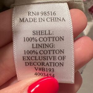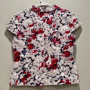 Great pre owned condition. Abstract/floral pattern. Collared, front button closure. Lined. 100% cotton. approx 18" pit2pit, 21" long