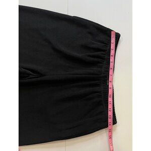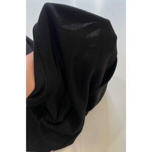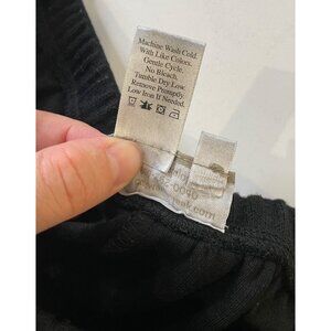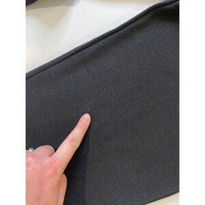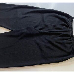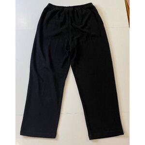 Black, straight leg pants with elastic waist and pockets. Knit, sweater-like material that is breathable and allows light to pass through when held up to light - see photo. Mature, minimalist, comfort. In good pre-worn condition with two small stains and typical signs of wear, see photos.