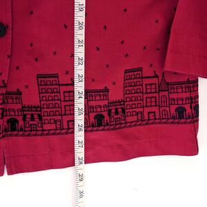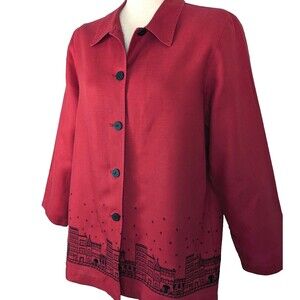 Coldwater Creek red button front lightweight jacket with embroidered cityscape border