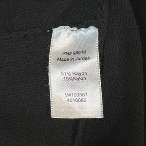 This beautiful black sweater from Coldwater Creek is perfect for any occasion, whether you're traveling or just out for a casual day. The 3/4 sleeve and scoop neck make it a stylish choice, while the tie front and banned hem add a unique touch. Made from a blend of nylon and rayon, it's easy to care for with a simple hand wash. This pullover sweater fits regular sized women and comes in size XL.