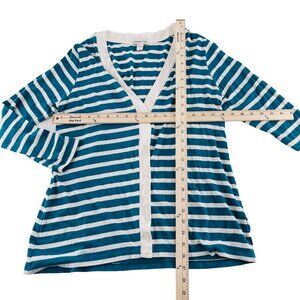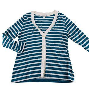 This Coldwater Creek cardigan sweater offers a classic striped design in blue and white. Its cotton blend fabric provides comfort and breathability, making it suitable for layering throughout the year.