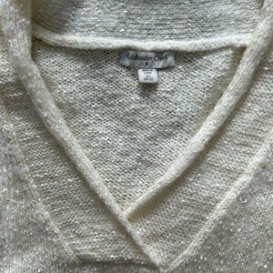 Elegant and cozy Coldwater Creek pullover sweater in a soft ivory/white shade with a subtle metallic shimmer. Features a flattering deep V-neckline and long sleeves. Lightweight knit blend (52% Nylon, 48% Acrylic) — soft, stretchy, and comfortable for layering.