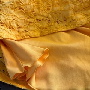 The Coldwater Creek Women's Top in size L is a vibrant mustard yellow floral blouse with a cap sleeve design and round neckline. Made from a blend of nylon, spandex, and cotton knit fabric, this top is perfect for a casual occasion with its regular fit and stretchy material. The cut out floral accents add a touch of flair to this classic style from the reputable brand, Coldwater Creek. The top is lined for extra comfort and comes in a regular size.