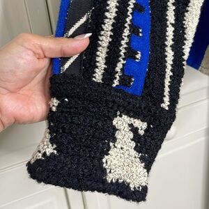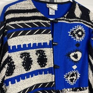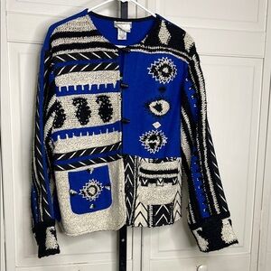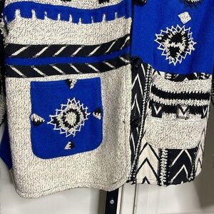 Stunning classic vintage Boho quilt geometric design in a stunning royal blue and off-white 20% wool 70% cotton blend. Lovely toggle buttons and two front pockets with embroidery overall. 2 front Pockets. Long Sleeve