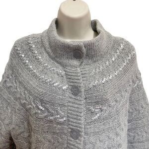 Beautiful, wool/rabbit blend cable knit cardigan with large faux shell buttons and sequins across top of chest and top of back. Has small hole in left shoulder which would be an easy fix for a talented seamstress…sadly, that’s not me. ;) I didn’t notice until I started to photograph.