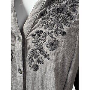 This Coldwater Creek tunic evokes a timeless charm with its intricate floral embroidery and flowing silhouette. The soft gray cotton fabric complements the delicate button-front design, making it a versatile statement piece.