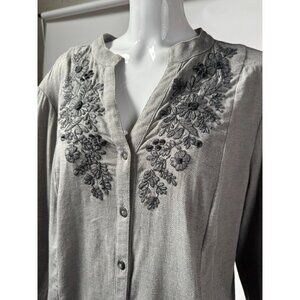 Coldwater Creek XL Embroidered Button-Front Tunic Top Gray 100% Cotton Long Slee