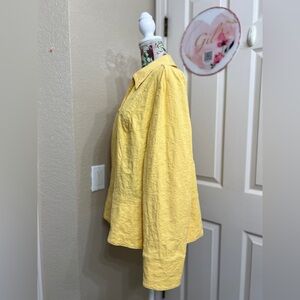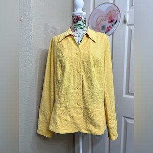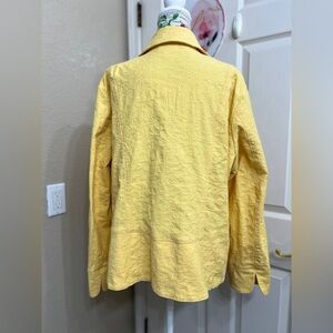 Bright yellow jacket. Button-up front. Classic collar. Long sleeves.
