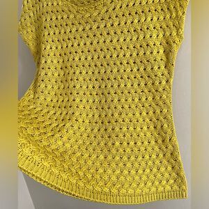 Coldwater Creek open-weave crochet knit top in a rich yellow/lime hue. Features a textured pattern, scoop neckline, and cap sleeves. Soft, lightweight acrylic yarn with a breathable, relaxed fit — perfect for layering over camis, tanks, or dresses.