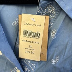 Women’s Coldwater Creek button down front three-quarter inch sleeve bandanna blouse. Size 3X. Shoulder to bottom measures approximately 29. Pit to pit measures approximately 26. NWT.
