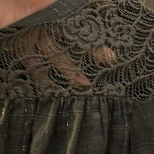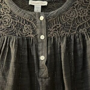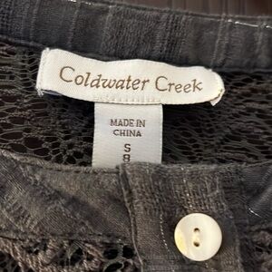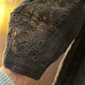 Coldwater Creek black with shiny silver lines. 3/4 sleeved blouse. See through lace at the neck and back and a see through panel on the sleeves. Size S/8