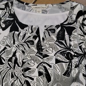 Excellent pre-owned condition. No flaws to note. Women's plus size Coldwater Creek black & white floral stretch jersey dress 1x.
