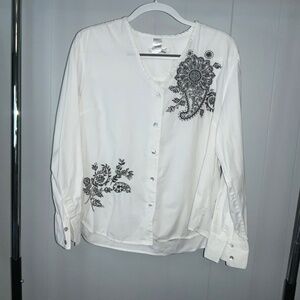 Coldwater Creek cotton blend off white button front embroidered blouse Sz L