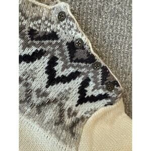 This is a gorgeous wool blend cream sweater with a brown and top fair aisle. Print with some bead work at the neck line 3 button closure excellent condition no flaws Womens size one X 18 never worn.