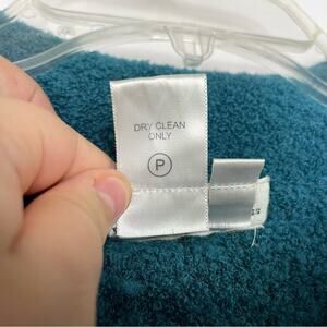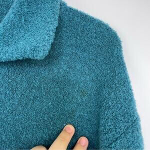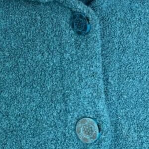 In good preowned condition. Couple light spots in front upper chest areas as pointed out in pictures. Button down sweater. Wool blend. See approximate measurements in pictures. Color is like a blue teal.