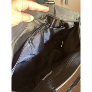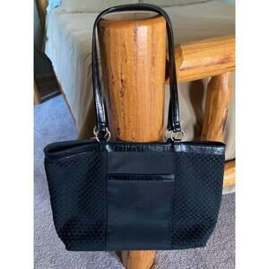 Black with silver trim Coldwater Creek handbag has several pockets...one on the front outside and one on the back outside. Inside there are three pockets on one side. On the other side there is a zip close pocket, 2 pen loops, and four credit card pockets. Purse has a zipper closure, silver rings attaching the handles to the bag and silver studs/feet on the bottom. Purse easily wipes clean with a damp cloth. Measures approximately 17 x 10.5 x 5 inches. Gently used condition, from a smoke-free, pet-free home.