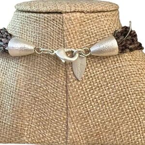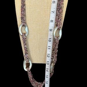 Long necklace approximately 16” long. Oblong iridescent multi colored beads - purple and black in between silvery circles. Nice silver clasp. Many strands
