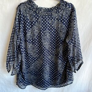 Coldwater Creek navy and gray ruffled V-neck blouse, size 1X. Generally good preowned condition. A button (silver perhaps) could be added at the end of each sleeve. The sleeves are currently open to allow ease of rolling, but there is a buttonhole if a button is preferred. Semi-sheer sleeves but the remainder of the semi-sheer portion has a layer of lining underneath.