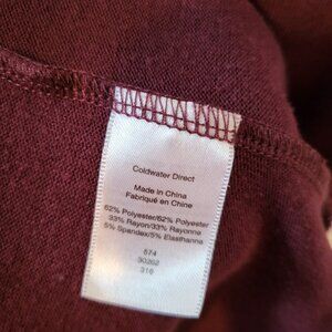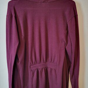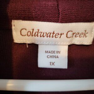 Coldwater Creek open front cardigan in a beautiful burgundy color. Size 1X. Fabric is super soft and made of 62% polyester, 33% rayon, and 5% spandex. Measures: sleeve length (shoulder to wrist) 24", chest 22", length (shoulder to hem) 26".