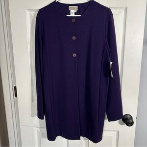 NEW! Coldwater Creek size large deep purple jacket/sweater. Lightweight, mid-thigh length, button close with three buttons at the top of the garment. Rayon/polyester/nylon, spandex blend. Long sleeve, round neck.