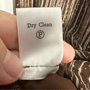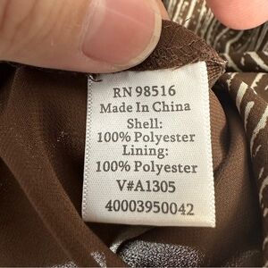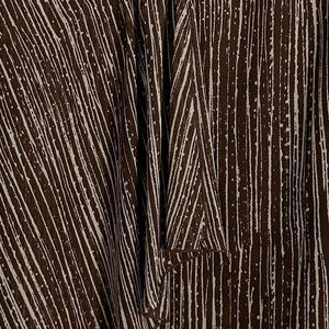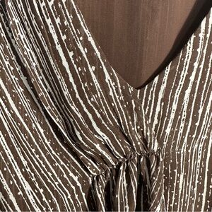Coldwater Creek size M (10-12) sleeveless v-neck top. Brown with a graphic pattern in cream. Gathered under the V neck with a flyaway panel, fully lined. Flowy, feminine.