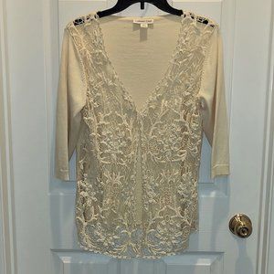 Beautiful cream color sweater vest/cardigan gives off Boho vibes with open weave lace & fabric designs cascading down the front on each side! You can wear it open or closed with the 4-buttoned loop closures. You will need a tank or cami underneath though as it's see-through in front! Elbow sleeves. 55% Raime 45% cotton with front design 100% cotton. Xtra button still attached. Size Large. Very nice piece in great condition!