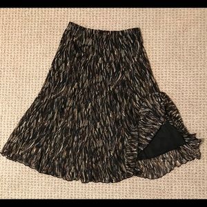 Flirty skirt with abstract pattern. Sixteen panels allow it to softly flare below the hip. Colors are black, brown, tan, and cream. Semi sheer polyester with a black lining. Elastic waist.