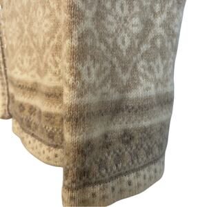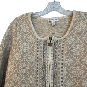 Coldwater Creek women’s Nordic inspired scoop neck, zip front sweater with long sleeves. The sweater has beading running down both sides of the front of the zipper with a snowflake accent charm.