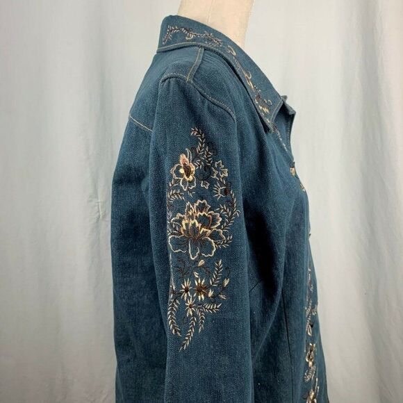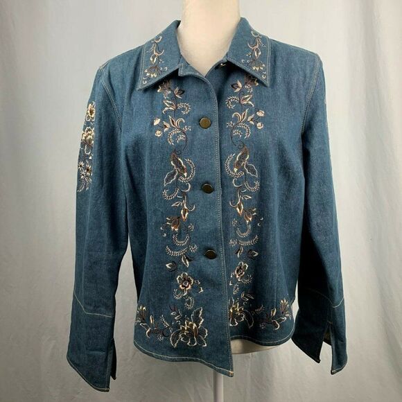 Coldwater Creek Cotton Denim Jacket S Floral Embroidery Flip Cuffs Button Down
