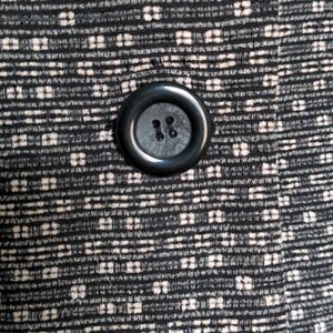 Fabric has ribbed texture similar to corduroy. Subtle grey/black stripes with beige squares. 4 large plastic buttons for closure.
