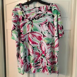 This fun western style long sleeve blouse is from Coldwater Creek. This item has button front and cuffs. The top also has a breast pocket on the left front side. This blouse is made from 100% cotton. The size is medium. The measurements are 28” L x 21” W (pit to pit) x 23” sleeve (shoulder to cuff). This blouse has been gently worn but it is in excellent condition.