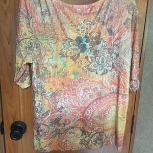 EUC. Coldwater Creek band women’s 3/4 length sleeves blouse in lotus flower print in gorgeous golds, oranges and browns. Round neck. Made in USA. Showing photos of front and back sides along with fiber content tag.
