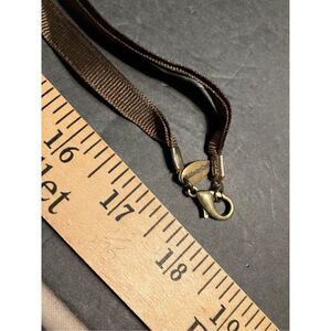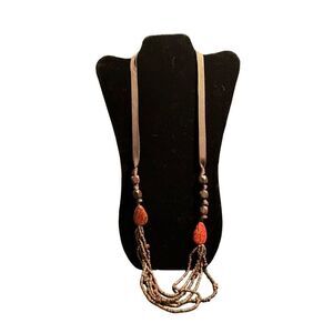 This is a perfect Fall necklace with burnt orange beads and brown grosgrain ribbon. It’s well made and like new in EUC