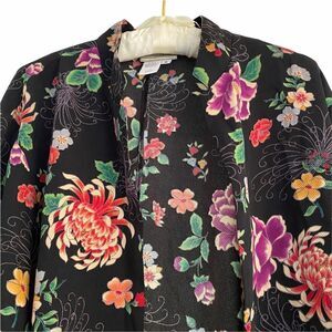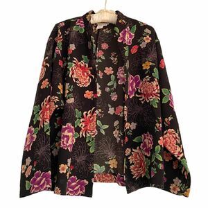 Soft and silky feeling polyester knit with a gorgeous floral pattern. Mandarin collar. Open front. Great preowned condition- no flaws- like new.