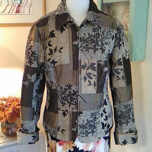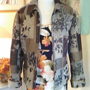 This fabric has the look of patchwork. Some sheen, some chenille, leaves, branches and berries. Front zip. Fully lined. Princess seaming front and back.size M measures 42 at chest, 39 at waist, 44 at bottom hem. 25 long from shoulder to hem. Sleeves 24 long as shown. Perfect for Fall. Great with dresses or pants and jeans.