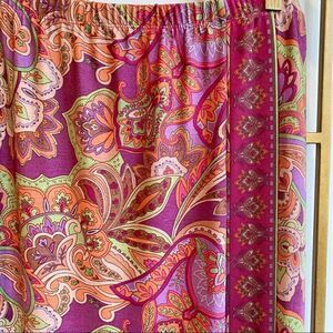 Petite Small/Medium. Colorful Paisley Print of Fuschia, orange, purple and green. Stretchy 100% polyester fabric with nice Drape and wrinkle free. Front side slit. Elastic Waist.