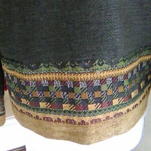 Pretty jacket with short, soft, grayish green  chenille fabric. Trim is strips of checkerboard brocade and embroidered chenille.  Button up front,  warm ocher lining. Size small measures 44 at chest, 43 at bottom hem. 24 long from shoulder to hem.Sleeves 23. Great for now, not too heavy, but it will keep you cozy.