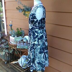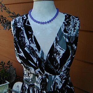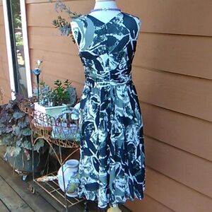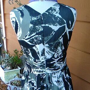 Gray and black abstract pattern on this pretty wrap front dress. Wide ruched and gathered waistband. Back zip. Lots of fabric, medium weight, fully lined. Says dry clean, but I washed and hung to dry and it came out beautifully. Size 10 measures 40 at chest, 32 at waist, , 44 long from shoulder to hem. Great career look, or for something that requires a dressier look.