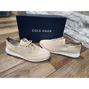 The Cole Haan 2 Zerogrand Stitchlite Oxford Perforated Lace Up Women's Shoes in Rye Knit, size 10, are a stylish and comfortable option for casual wear. Featuring a breathable knit upper, these sneakers offer both stretch and support with a flat heel and rubber outsole. The beige color and solid pattern make them versatile for various occasions, while the lace-up closure ensures a secure fit. Perfect for women who value both fashion and functionality in their athletic shoes, these Cole Haan shoes are a great addition to any wardrobe.