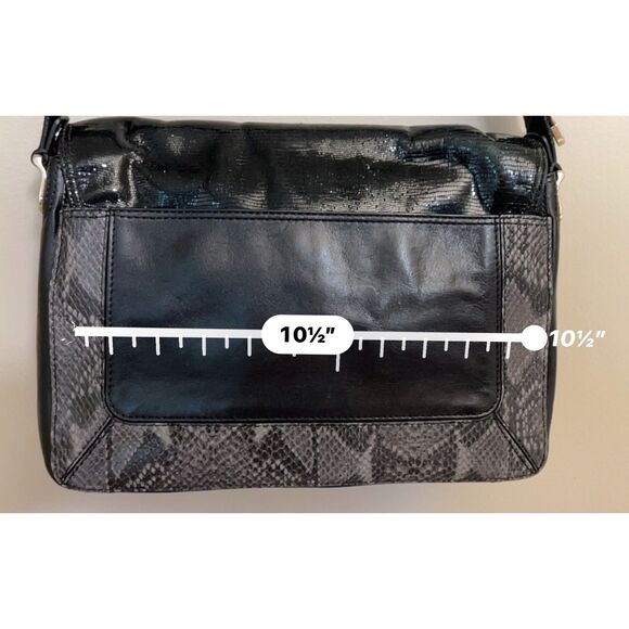 Black patent leather on upper section of bag with a snakeskin print on the lower section.
