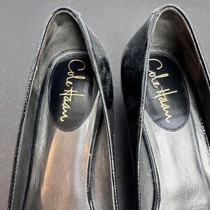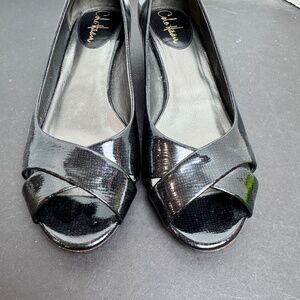 Cole Haan Air Elly Criss-Cross Black Patent Peep-Toe wedges. Size 8. 1” Heel in very nice condition.