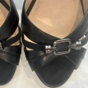 Cole Haan Nike Air Collection black leather pumps provides Nike Air technology for both comfort and style. Peep toe with buckle detail. Suede detail at back adds extra interest.