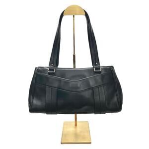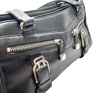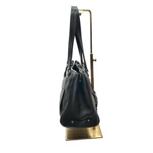 Cole Haan Alexa SP05 leather shopper bag featuring black smooth grain leather with silver hardware. Exterior designed with (2) diagonal zip pockets with leather zipper pulls and metal logo accents. Exterior back has large chevron pattern slip pocket with a magnetic snap closure. Interior has