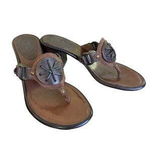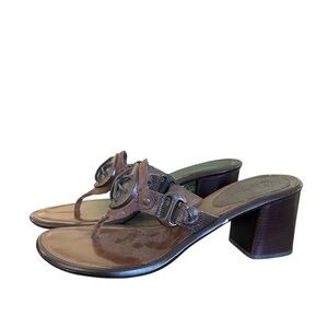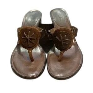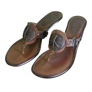Experience the perfect blend of elegance and comfort with these Cole Haan sandals. Crafted from rich brown leather, they feature a sophisticated medallion detail on the thong strap. The contoured footbed ensures all-day comfort, making them ideal for both casual and dressy occasions.