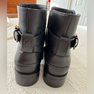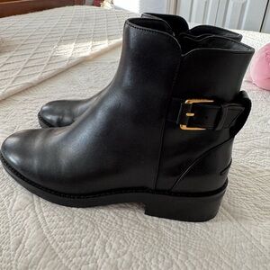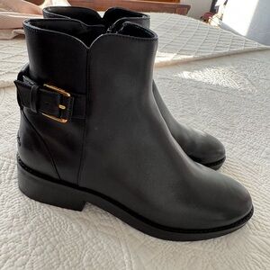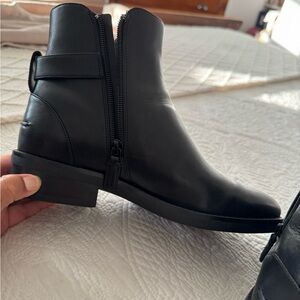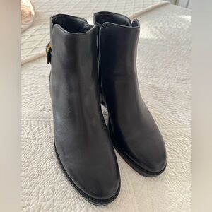 Sleek black leather ankle boots. Side zipper closure. Elegant and versatile design.