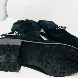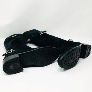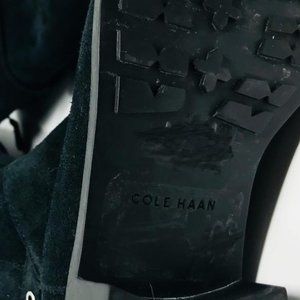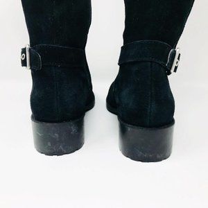These women's Cole Haan Black Suede Boots are in a size 6 B. These are in excellent used condition. It looks as if they were worn once or have light shelf wear. The back of the heels have slight markings. Otherwise, there are no flaws. The boots come up to the knees and have knee and ankle buck details. These boots have side zippers, and are waterproof.