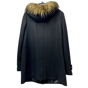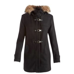 sophisticated style of this wool-blend coat that helps keep the cold out and heat in for long-lasting, comfortable wear. A faux fur trim lends
