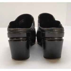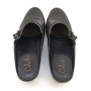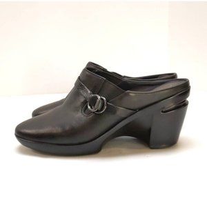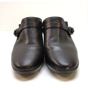 Elegant black leather mules with a sleek design. Features a comfortable heel and stylish buckle detail.